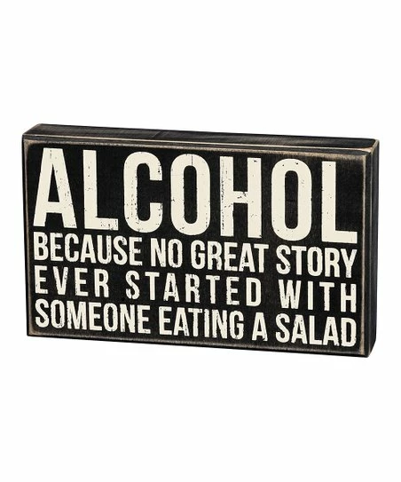 This box sign’s alcohol-themed message adds a humorous touch to your home décor.