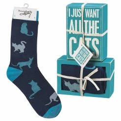 Show off this pair of cat-themed socks as part of your quirky wardrobe ideas. A matching box sign features a playful message to display as part of your dΓ©cor.