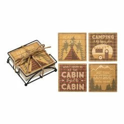 - Includes one brown tent coaster, one brown camper coaster, one red plaid coaster, one brown mountain coaster and one black holder (five pieces total)