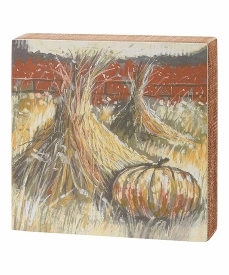 Add a festive flourish to your home by displaying this wood block sign featuring a harvest-inspired graphic.