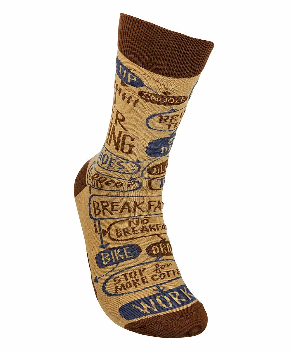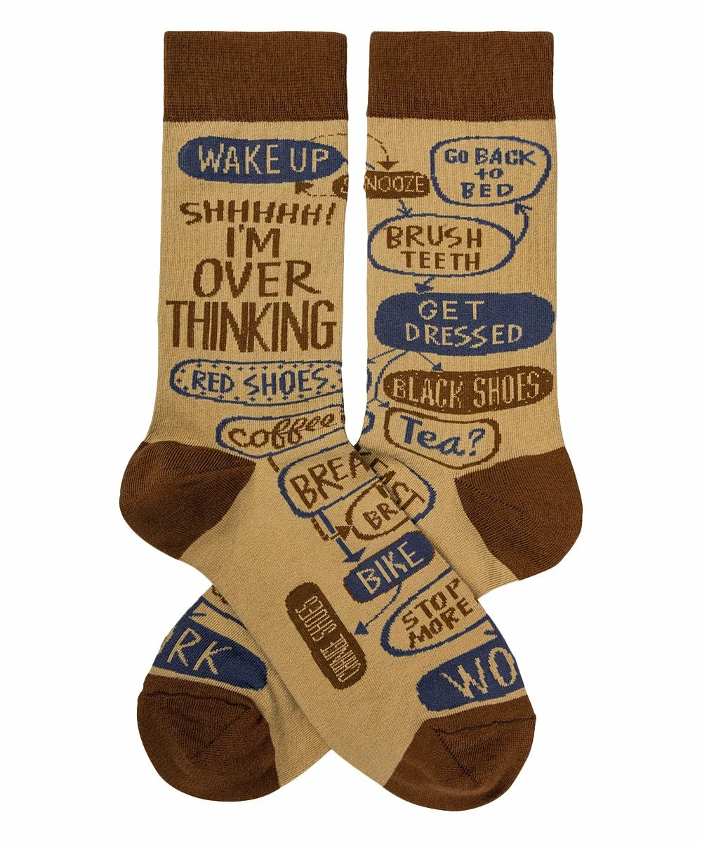 - Full graphic text: Shhhh! I’m overthinking, wake up, red shoes, coffee, break, bike, stop more, work, tea? change shoes, black shoes, brush teeth, go back to bed, snooze, breakfast.