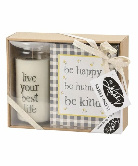 Add some positive messages to your home with this set featuring a gingham box sign and soy candle featuring lighthearted quotes.