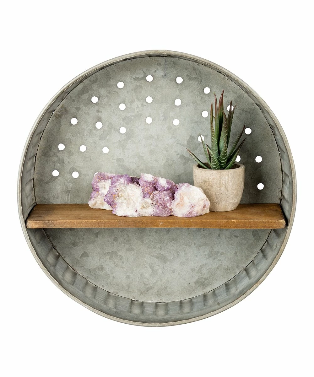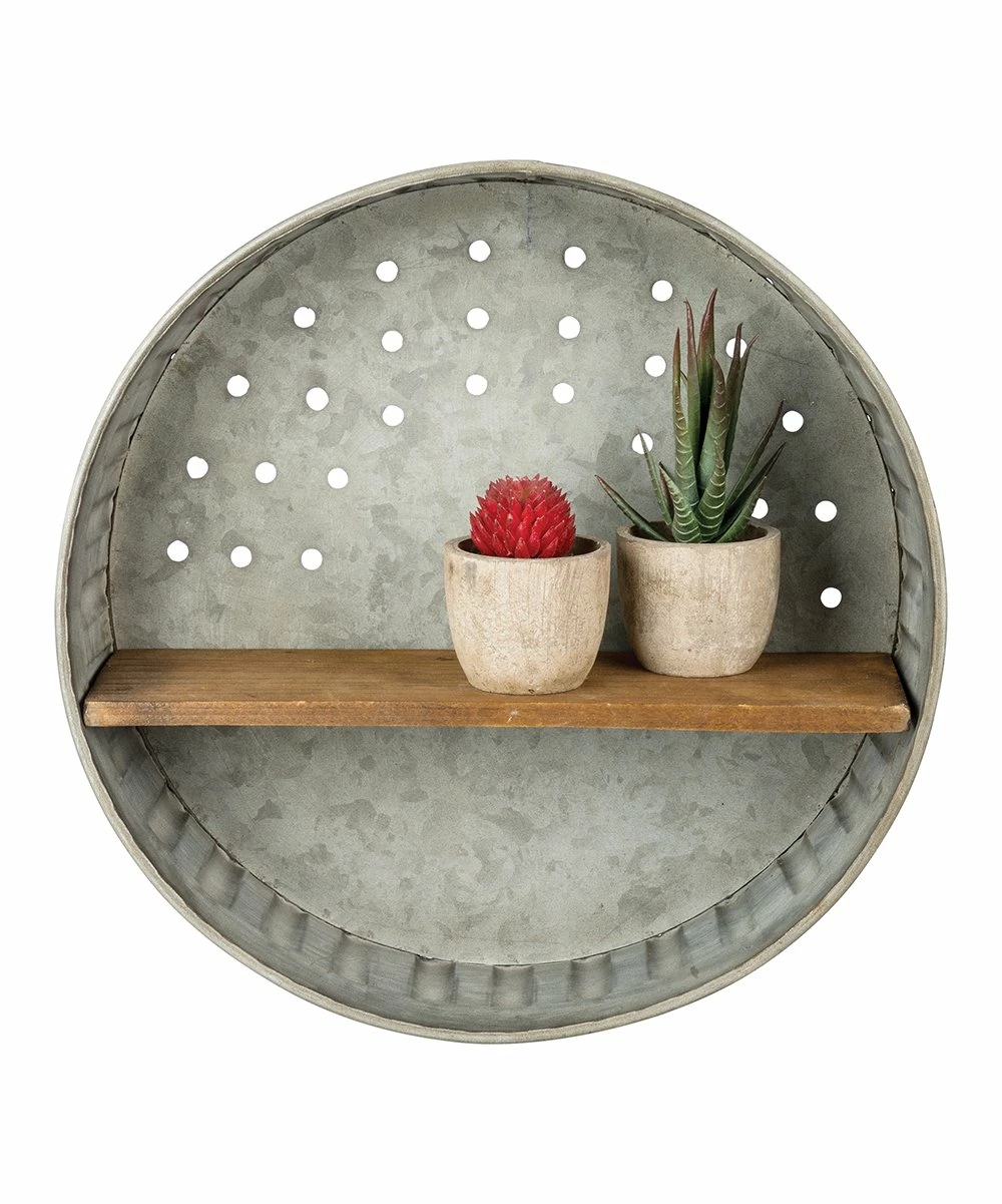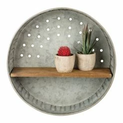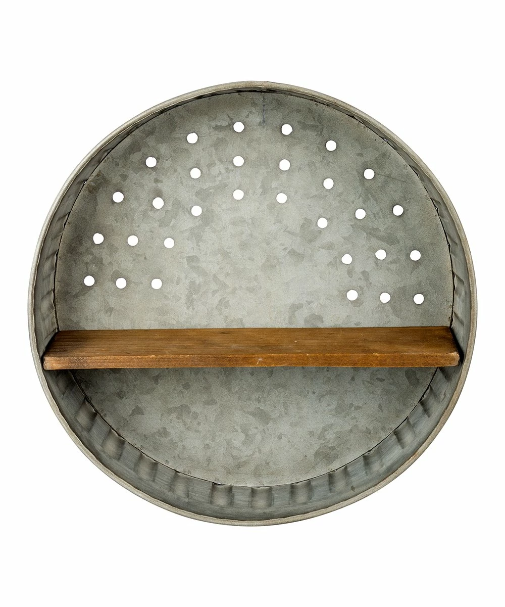 Personalize your space with the shabby-chic charm of this vintage-inspired metal and wooden wall shelf, flaunting a whimiscal round shape.
