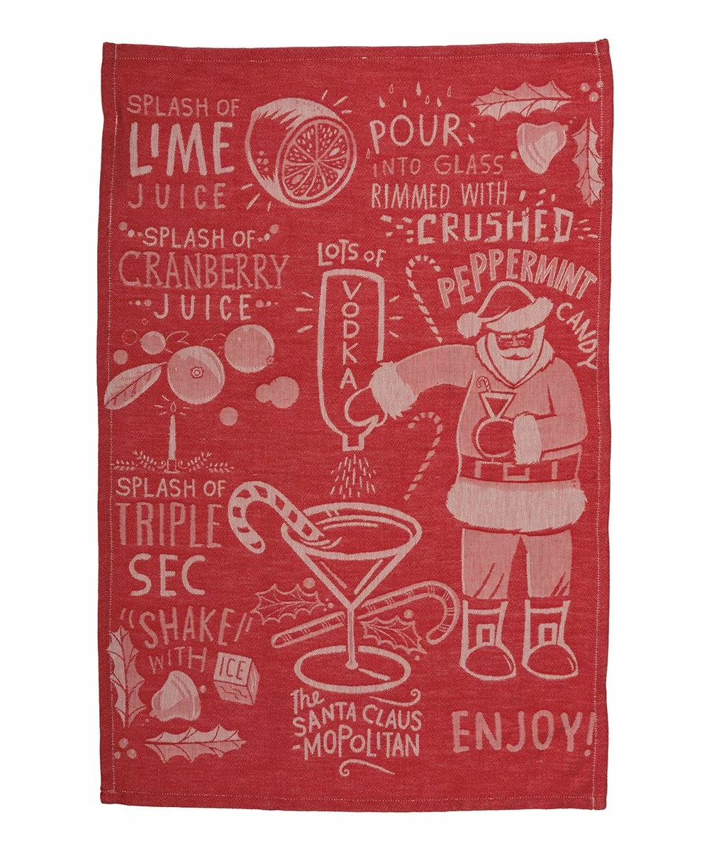 - Full graphic text: Splash of lime juice. Splash of cranberry juice. Splash of triple sec. Lots of vodka. Shake with ice. Pour into glass rimmed with crushed peppermint candy. The Santa Claus-mopolitan. Enjoy!