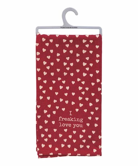 Add a charming accent to your kitchen displays with this dish towel’s whimsical heart print and playful message.