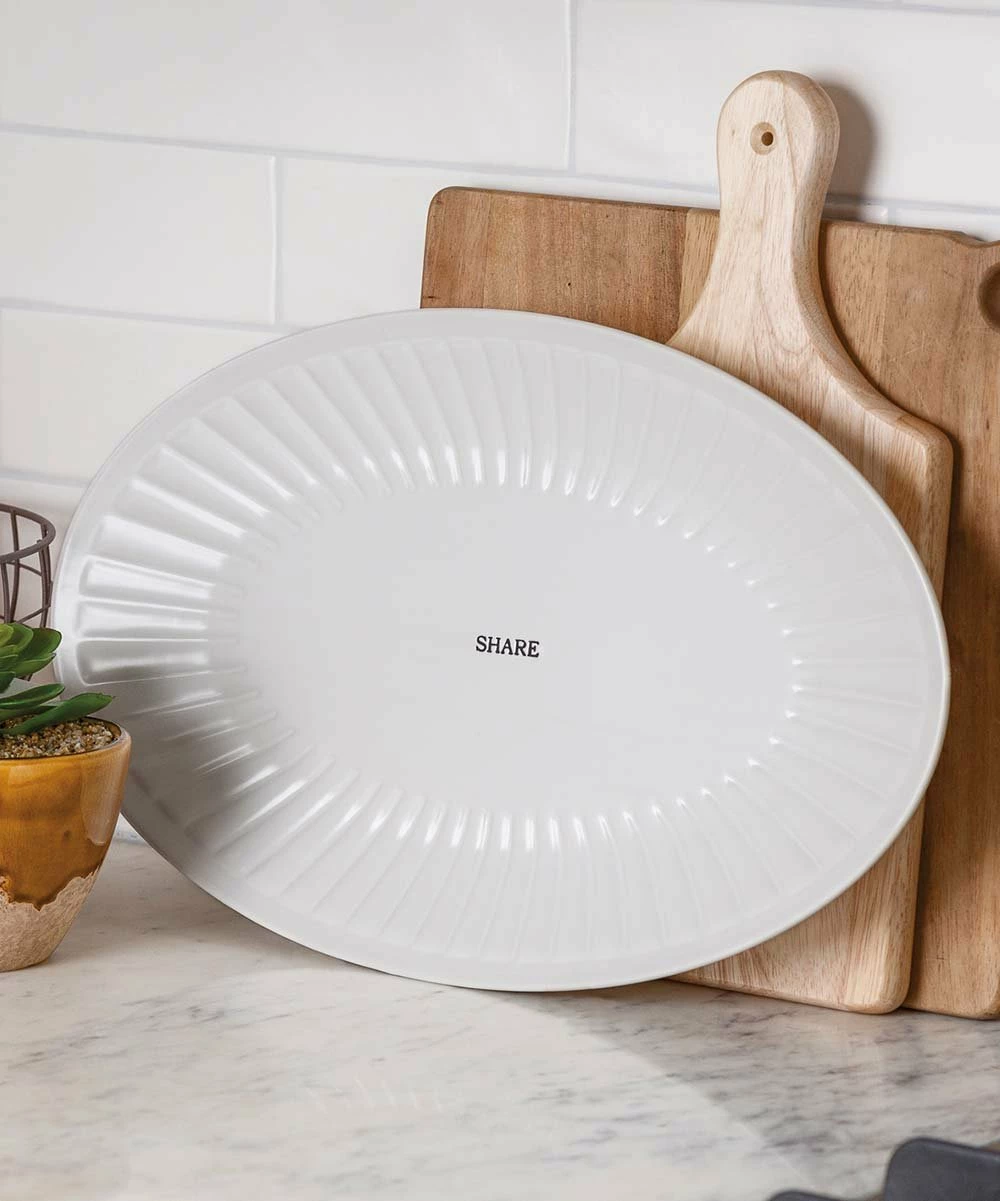 Achieve a classically Americana kitchen with this sleek stoneware platter detailed by modern text that inspires cooking with care.